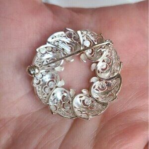 Vintage Sterling Silver Round Circle Wreath Christmas Decorative Brooch Pin