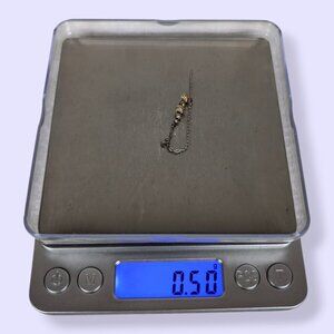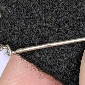This vintage piece is called a "threader earring" (today I learned) and can be worn in multiple ways, and threaded through more than one piercing hole. The "head" of the earring is a straight pin (stamped 925), followed by a very dainty chain, and capped with silver and gold tone balls on the end. I was a little unsure of the idea of pulling a chain through an ear piercing but the chain is quite dainty and smooth, making any pulling painless and free of struggle. There is light wear and there are no issues affecting wearability.