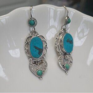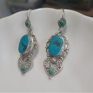 Vintage Sterling Silver Turquoise Boho Western Tribal Exotic Drop Earrings