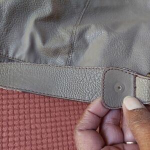 Vintage* Steve Madden Large Hobo Handbag/Purse. 2 zippered front pockets with combined snap closure pockets. Wide short strap has some wear showing. See photos. (Personally, I would replace the strap.) Note 2 metal beads missing but does not affect anything on the strap. Zippered bottom increases width of bag by approx 6". Lots of room. Top snap closure. Approx 18" x 16" x 6". Colour - taupe.