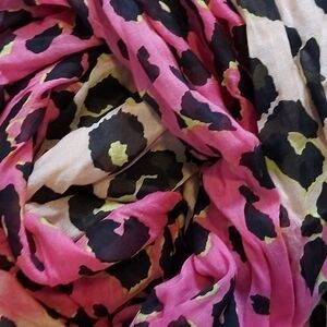 EUC Barbie and baby pink with lime accents Distressed fringe on shorter side 76 x 40 inches