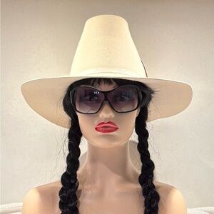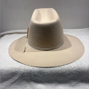Cream felt hat features a wide brim, satin inner lining, and a vibrant feather accent for an authentic Western flair.