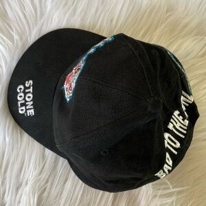 This hat is a rare find. 1998 Titansports WWF Attitude hat. Embroidered skeleton snake wraparound with “STONE COLD” on the brim and “BAD TO THE BONZ” on the back. Some discolouration on the inside band and a spot under the bill. Also some loose strings. Great vintage condition. A true wrestling collector’s piece.