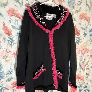 Charming black cardigan with vibrant pink trim. Features floral embroidery. Cozy and stylish.