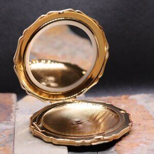 This exquisite Stratton powder compact features a rich teal enamel finish depicting a serene Victorian scene and framed with gold-tone accents. The scalloped edge adds a touch of sophistication, making this compact a standout piece. A perfect addition for collectors of mid-century vanity accessories or lovers of vintage charm!