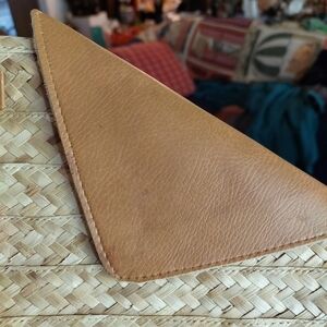 Interesting design! Straw weave and leatherette crossbody handbag. Snap flap closure. Inside pocket. Narrow. Long crossbody strap in great shape. Pre-owned with small blemish on flap from handling. No name.