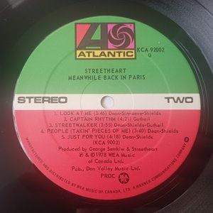 This is the 1978 first pressing of Streetheart Meanwhile Back in Paris vinyl record. This is the debut album for Streetheart. The album cover and vinyl record are original to 1978. Atlantic Records, KCA 92002.