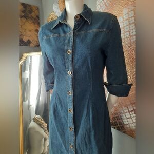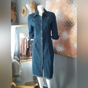 gorgeous vintage stretch cotton dark wash midi dress with distressed hemline. great condition, no flaws to mention. genuine item from the 1990s. purchased at Siberia Vintage in Hamilton Ontario. 3/4 sleeves with brasstone button details. see pics for material composition. fitted with some stretch. vintage size 7, modern size small. see flat lay measurements below!.