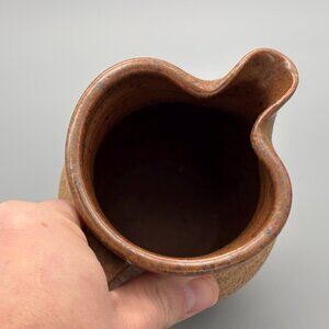 Vintage 6 inch studio pottery pitcher crafted in speckled stoneware with a warm brown glazed rim that flows subtly into the body. The rounded form shows gentle wheel-thrown lines, giving it a natural handcrafted character. Its sturdy handle and classic shape make it practical for serving, while the earthy tones allow it to blend seamlessly into rustic or artisan pottery collections.