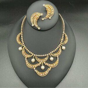 Stunning Crystal Rhinestone and Pearl Bib Vintage Necklace and Earring Set