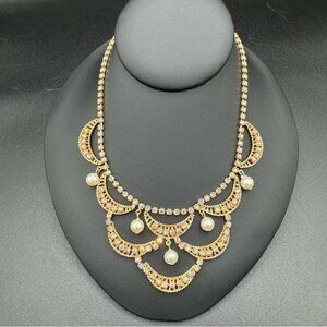 The necklace features a stunning bib design, with rows of shimmering crystals and luminous pearls cascading down the neckline. The clip on earrings match perfectly, adding a touch of glamour to your look.
