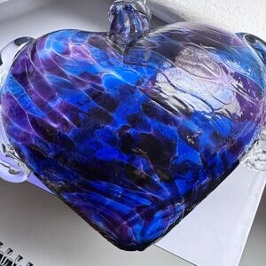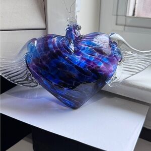 ⚡️Stunning hand-blown glass art piece featuring a heart with outstretched wings. Crafted in rich shades of blue and purple with a swirled, textured finish, accented by clear glass wings. This one-of-a-kind piece captures light beautifully and makes a striking statement in any space.
