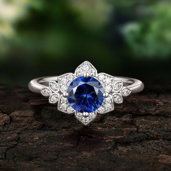 Vintage Style Floral ring - Blue Sapphire, Flower Ring September Birthstone