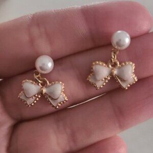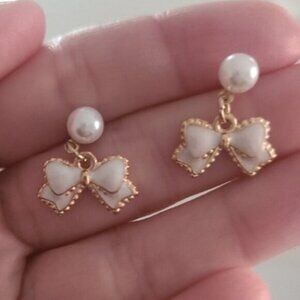 Vintage Style Gold Pearl Bow Coquette Girlhood Dainty Feminine Drop Earrings