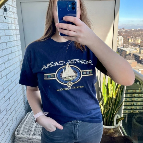 Vintage Style Punta Cana Dominican Republic Dad Tourist T Shirt. Navy blue with beige detailing. Sailboat graphic. Size large. Excellent condition.