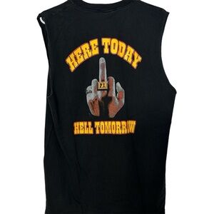 Back: Graphic with fist, "HERE TODAY," and "HELL TOMORROW"
