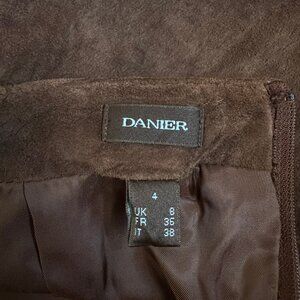 Embrace effortless autumn style with this chic, genuine suede leather midi skirt, featuring a flattering column silhouette, uneven hem, front slit, bow tie beaded detail. Its rich chocolate brown hue and high quality composition make it a timeless addition to any wardrobe, easily paired with everything from cozy knits to crisp blouses