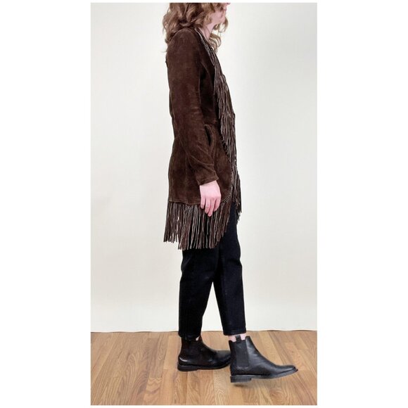 Vintage Suede Leather Fringe Western Boho Cowgirl Long Jacket Coat Fall Bohemian