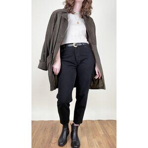 This stunning dark green brown suede leather suit offers a luxurious unique style, perfect for elevated everyday wear or special occasions. The ensemble features a long, relaxed-fit jacket with spacious pockets and matching straight-leg high waisted trousers, creating a chic silhouette. Great to coordinate or mix and match!