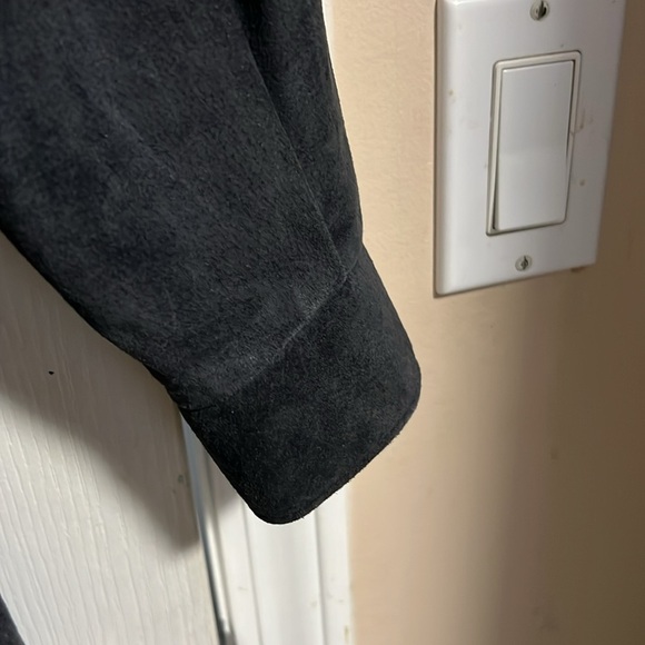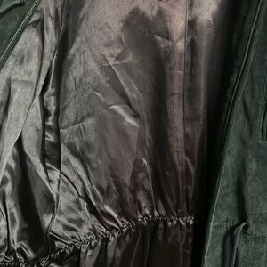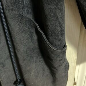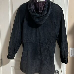 Beautiful, detailed hooded suede jacket with drawstring waist, zipper, pockets, and lining. This coat is from approximately 1980s. Believed to be a Women's because the shoulders are padded. In very good vintage condition put to pit 20 inches. Listed as an XS