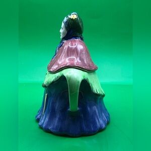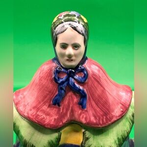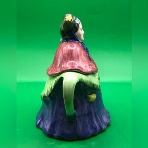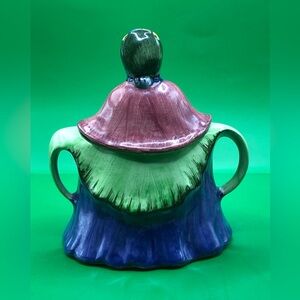 This delightful Little Old Lady sugar bowl is a lovely, quirky piece for any tea lover’s collection! Dressed in Victorian garb complete with full length skirt, cape and flowered bonnet. She also carries a yellow handbag and parasol.