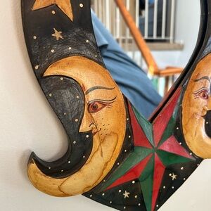Vintage wood stars, moons and sun mirror made in Indonesia. Mirror has some markings that don’t seem to come off with cleaning. Some paint chipping throughout mainly on edges. Water spot. Approximately 23 inches long. 11.5" at widest point. Some water marks. In great condition! rare piece! See pics! Collectors dream!