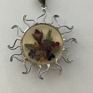 Unique handmade pendant featuring real pressed flowers encased in resin, set in 925 Sterling silver sunburst frame. It's about 2 inches in diameter. Comes in a box, ready to wear or gift!