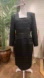 Beautiful vintage Sunny Choi black wool midi sheath dress with satin ribbon banding, square neckline, removable shoulder pads, full lining intact, and a back kick split for movement. Made in Canada.