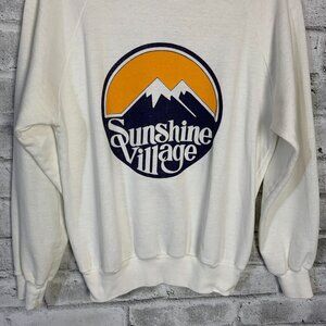 This vintage Sunshine Village sweatshirt is a must-have for any skiing or snowboarding enthusiast. The crewneck design and pullover closure make it easy to wear, while the long dolman sleeves keep you warm during the winter season. The white blended fabric with a graphic print is perfect for any outdoor activity, and the retro 80s and 90s style adds a touch of nostalgia to your wardrobe. It's machine washable and has a chest size of 40 inches, making it a great addition to any casual or travel outfit. The sweatshirt is from an unknown country or region of manufacture, but its quality and style speak for themselves. Get ready to hit the slopes or just lounge around in this comfortable and stylish sweatshirt.