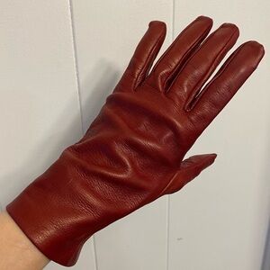 Very soft leather vintage gloves. Red. Slits at the wrist. Leather in great condition, though there is some discolouration, mostly on the palm side of each glove. Still tons of life in these beauties. No tags or brand markings.