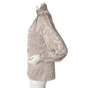 Retro 80s blouse with high button neck and ruffled/gathered cuffs makes with arms fun and billowy! This button down blouse has a pretty satin jacquard style fabric with a leaf print.