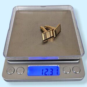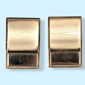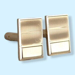 These vintage cufflinks by Swank are made of a gold tone metal and have toggle backs. The fronts of the cufflinks are shaped like tall rectangles and have two sections: a small section with a flat, polished finish, and a larger section with a textured, brushed finish. Both pieces are stamped SWANK on one of their posts. There is normal wear throughout, but no issues affecting wearability.