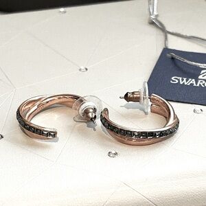 Add refined elegance to your look with these gorgeous Swarovski rose gold-tone hoop earrings, featuring a row of dark black crystals set in a sleek, curved design. The perfect balance of sparkle and edge, these hoops are ideal for both everyday wear and special occasions.