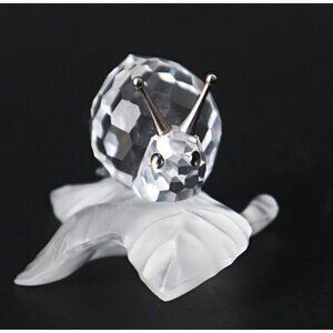 For your consideration is a Swarovski crystal snail on a vine frosted and clear crystal figurine. The intricately faceted snail has shiny silver tone tentacles and iridescent eyes. He is on a curved frosted leaf.