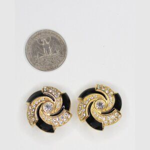 Vintage Swarovski Swirl Earrings Gold Tone Black Enamel Clear Pave Rhinestones