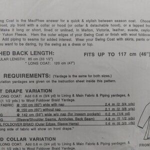 The Swing Coat is the MacPhee answer for a quick & stylish between season coat. Choose from a draped front, zip front with a collar or hood (or collar & detachable hood), or a lapped front with a collar. Make it long or short, lined or unlined, in Melton, Victoria, leather, suede, ceylon, crinkle nylon, or Yukon Fleece. Hem the outer edges of your Swing Coat or finish with wool foldover braid or serging. Add piping to seams for added interest. Wear your Swing Coat with skirts, pants or leggings. And if you want to be daring, try the swing as a dress or top.