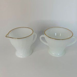 Get ready to add some glam to your collection with this stunning Swirl Golden Shell Lustre Creamer & Open Sugar by Anchor Hocking / Fire King!