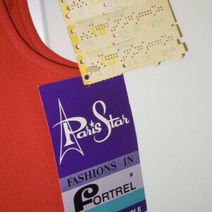 New with tags - never worn. 60s or maybe early 70s. Bright orange - made by Paris Star of Canada. Size tag indicates 16 and original price was $24.00, which in today's standards was a lot of money considering this was purchased in the 60s or 70s. A size 16 from the 60s or 70s is a lot smaller than a size 16 in today's standards. This would probably fit a woman's size Medium or size 12. Made of fortrel/polyester. To ensure a good fit please compare my measurements with an article of clothing you own to ensue a good fit. Laing down Across back, from armpit to armpit is: 18". From shoulder to bottom hem is: 26". Waist is 32".