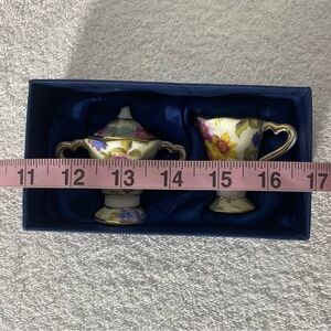 Good vintage condition. No cracks or chips. The tip of the handle on the sugar bowl has broken off, I don’t have the broken piece. See close ups. Please look at all pics and zoom in for a closer view. Measurements in pics.