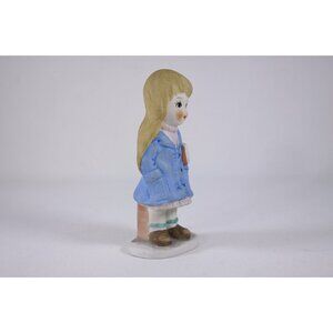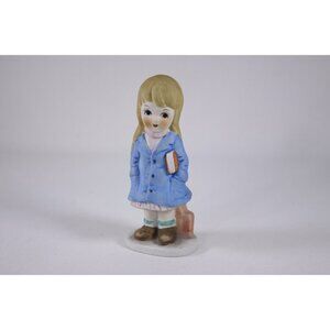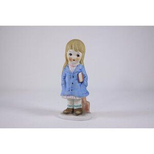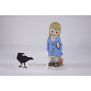 A delightful figurine of a young girl with blonde long hair in a pink dress, blue coat and a book under her arm. She is in the classic Lefton style, but only marked for Taiwan 2117 underneath. Possibly UCGC, With a few small marks, this would make a sweet addition to a child's room or nursery decor. Dates ca 1980s