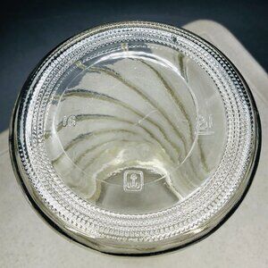 Features a clear glass body with a distinctive swirl pattern. Screw-on plastic lid with spout and cap.