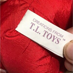 This vintage Santa Claus doll by T.L. Toys showcases a festive design with a red satin outfit, white trim, and a green sack. Will add a nostalgic touch to holiday decorations, embodying classic Christmas charm.