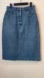 It features a classic pencil silhouette in a light to medium blue wash. The skirt is made of 100% cotton and has a front zipper closure with a button at the waist. It includes two front pockets and two back pockets. There is a slit at the back hem.