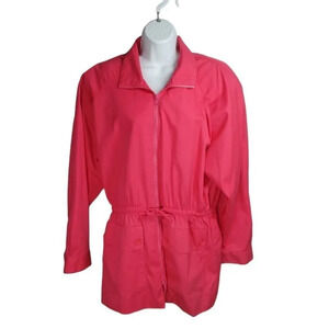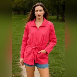 Vibrant shirt style jacket/coat. Oversized fit. Zipper close. Elastic, drawstring waistband. Large, buttoned cargo-style front pockets. Lightly padded shoulders. Lighter weight fabric. Wind resistant.