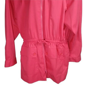 Vibrant shirt style jacket/coat. Oversized fit. Zipper close. Elastic, drawstring waistband. Large, buttoned cargo-style front pockets. Lightly padded shoulders. Lighter weight fabric. Wind resistant.