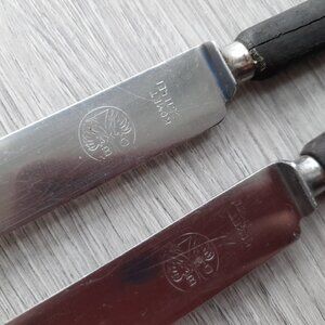 These are in fair used vintage condition. The handles are cracked, makers marks worn, few little rust spots and the handles are a little loose.