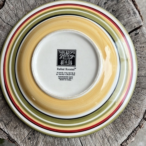 Hand painted small plate from Tabletops Gallery. Raphael Rooster. Some small nicks around outer edge, as pictured. Some small scratches/nicks on plate around rooster. These are quite faint, pictured in image 4.