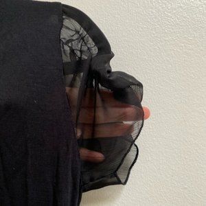 Vintage Tahari basic black short sleeve t-shirt. Contrast cinched puffy sleeves made of chiffon organza sheer material. Ruffle trim around neckline.