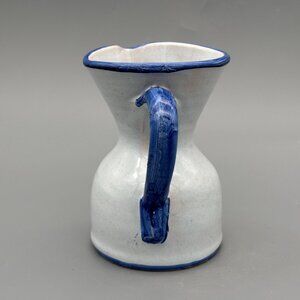 Vintage 7 inch Talavera pottery pitcher featuring a hand-painted grape cluster and leafy detail on a softly speckled white base. The sculpted spout and handle are highlighted with deep blue trim, giving the piece a classic Talavera look. Its curving form and bright painted accents make it a charming addition to traditional Mexican ceramic collections and a colorful accent for everyday use or display.