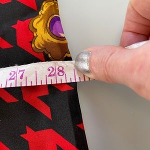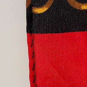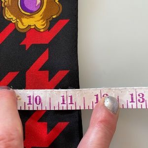 The tags were cut off this scarf, but it is by Echo, a Talbots brand of silk scarves. Edges are rolled and hand-stitched with nice quality. Red and black herringbone with pink and purple bonbons on the sides. Measures about 11.5" wide by about 57" long.